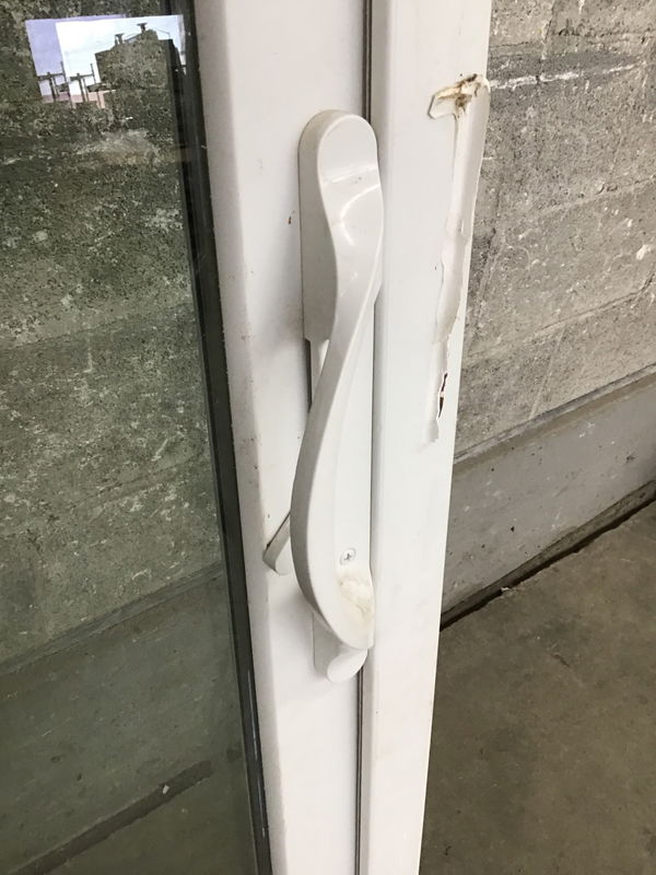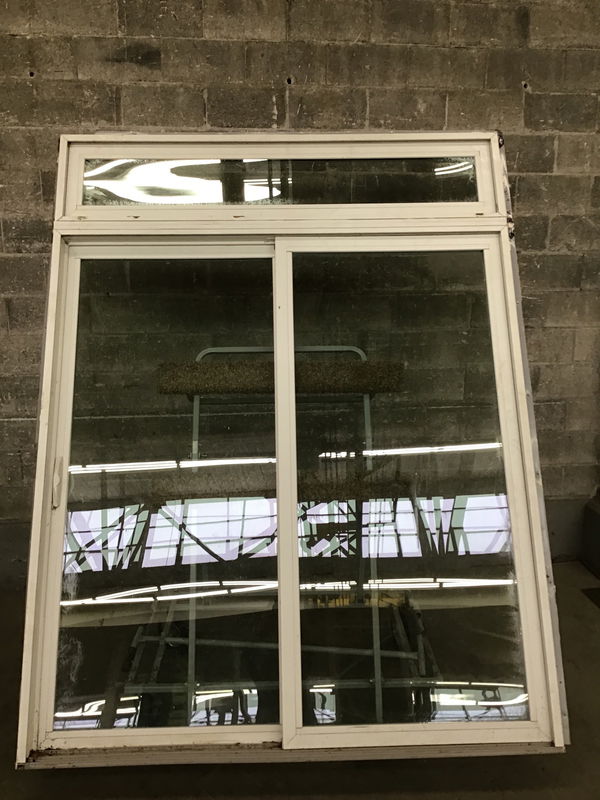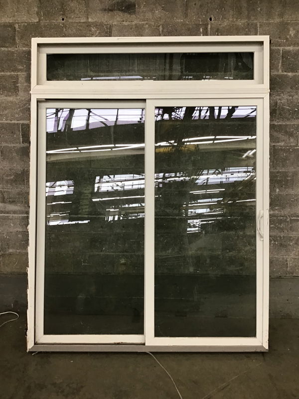 OX vinyl clad exterior sliding glass door. Nailing fins are a little bent and it could go for a good cleaning, but otherwise in good reusable condition.