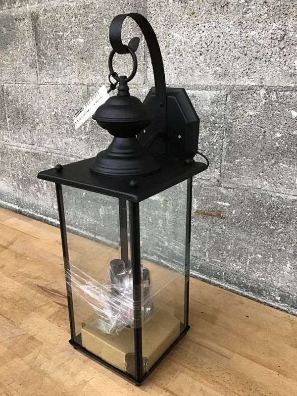Generation Lighting Jamestowne Transitional 2-light outdoor exterior wall lantern in black finish with clear beveled glass panels. Came to us in its original box and include mounting bracket plus instructions. Suitable for wet locations.