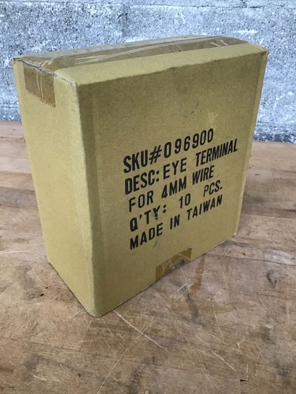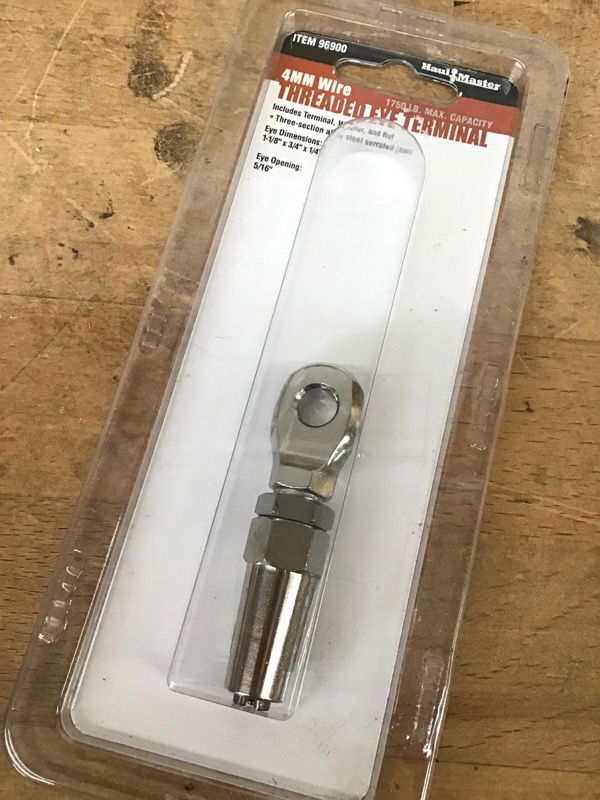 New box of 10 threaded eye terminals for 4mm wire with 5/16" eye opening. Includes terminal, washer and nut. 1750lb max capacity. Ideal for making a railing with steel cable, or rigging up your sailboat! Retail for $14 each.