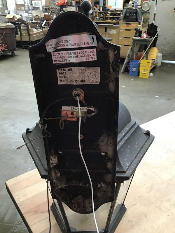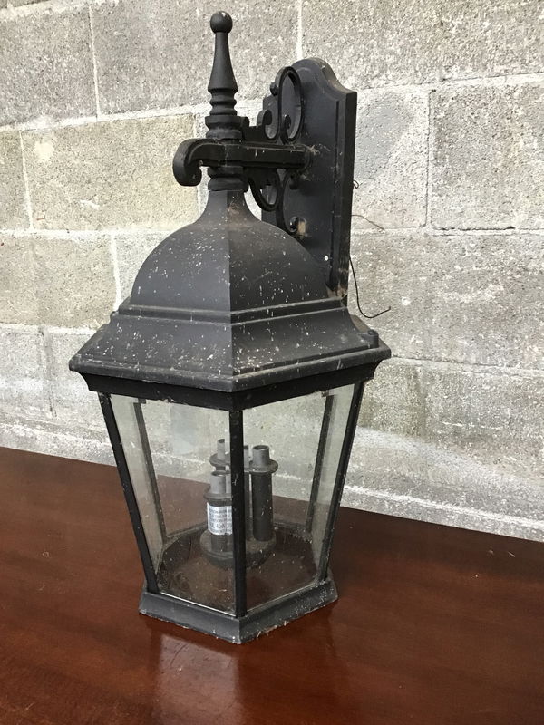 Large and in charge porch lantern with a decorative arm and three candelabra sockets. Will need a good clean and a new mounting bracket. Suitable for wet locations.