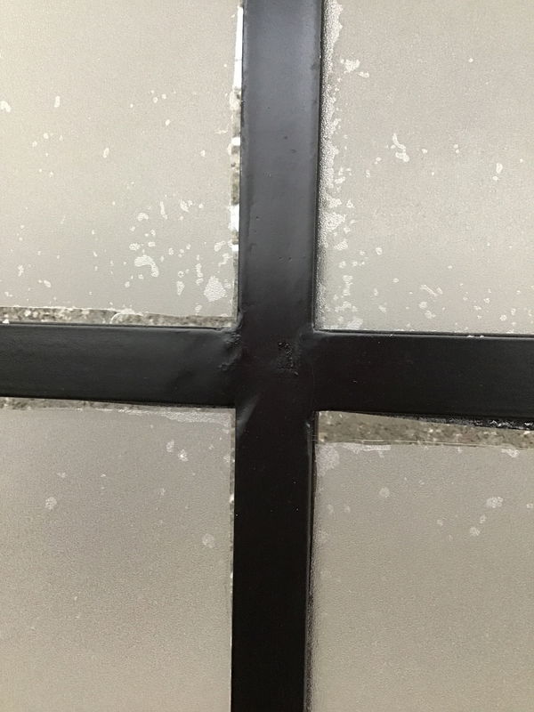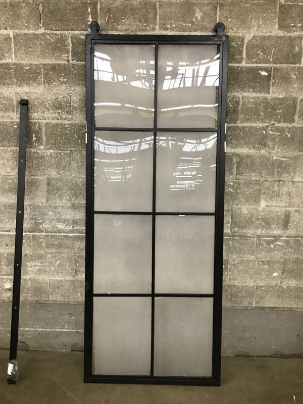 Sliding glass barn door with track and all hardware for an easy install. Includes 79.75" of track. Listed measurements are for the door with attached rollers. Note: The door is made out of steel and the hanging roller hardware is welded to the frame. The glass is faux divided and has obscured film on the glass that can be removed if you'd like it clear. The "glass" has come loose a little from the frame (see fourth photo), and looks like it was just installed using double sided tape. You might need to get some more.