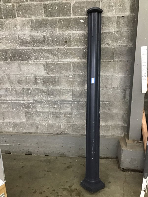 This painted fir column cover fits around a corner to give it a little more decorative flair. Painted grey with some wear and tear. Inside measures 5"W.
