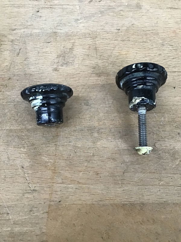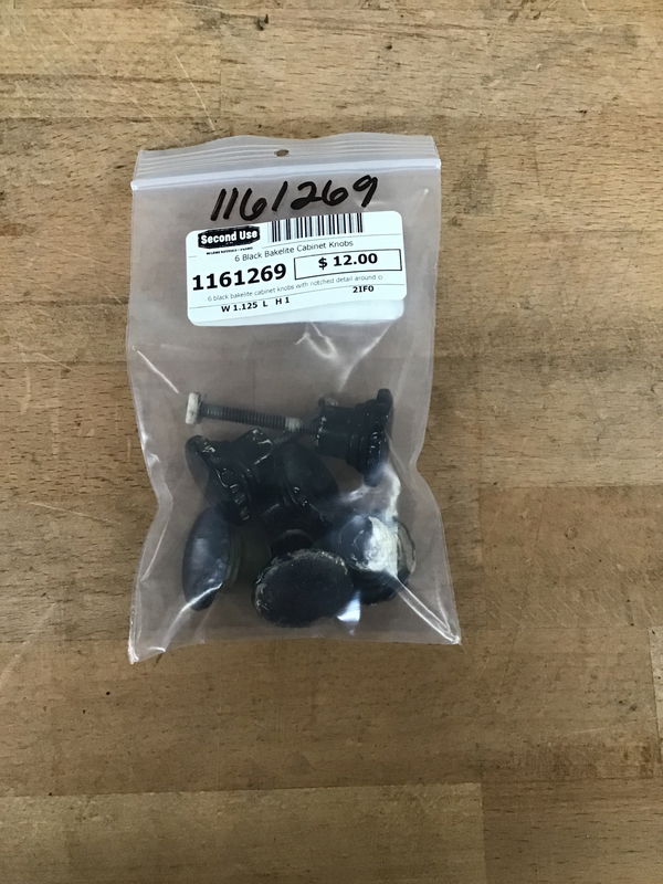 6 black bakelite cabinet knobs with notched detail around circumference. Fair condition with some paint that should clean off and some wear from age.