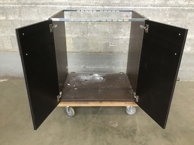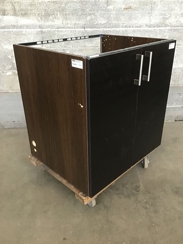 From IKEA, this sink base cabinet features dark wood grain photo finish, steel supports and two doors. Some wear. Missing toe kick. Retails for $150+.