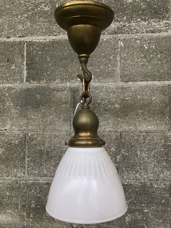Beautiful craftsman-esque pendant light with an aged brass fitter and delicate milk glass shade with a waffle texture on the top half.