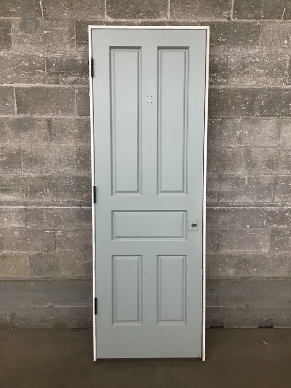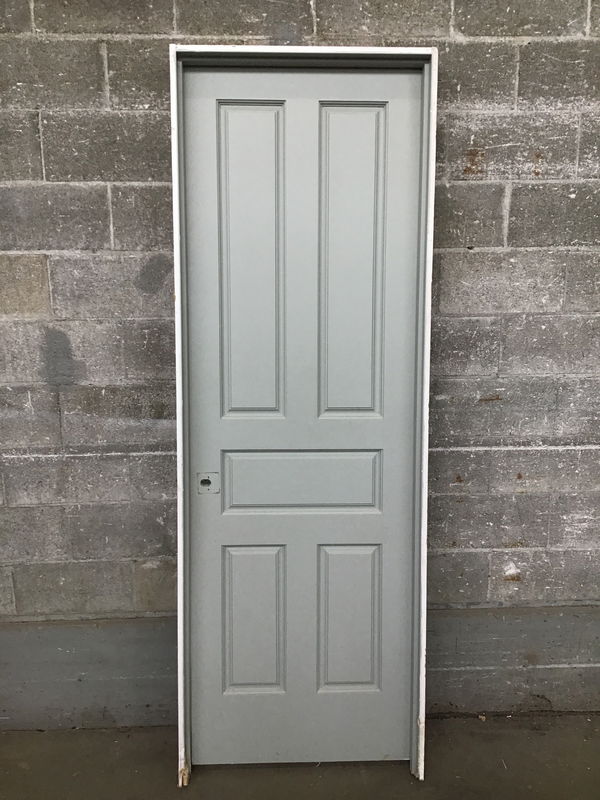 Hearty, attractive solid five panel door with unique panel configuration. This door's paint job is tight and it is great shape overall.