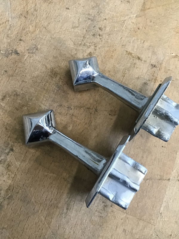 Set of four, mid-century, chrome, tile-in towel bars. They are in fine shape with minor cosmetic wear expected from hardware this age. All set have a matching geometric design. Sold as a set.