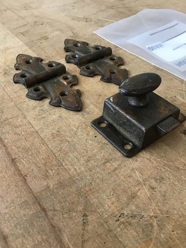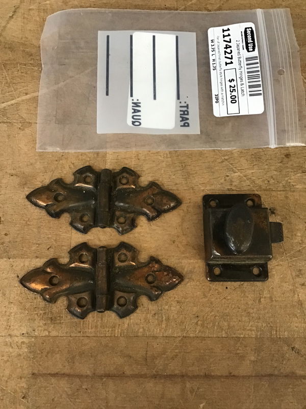 Pair of Japaned finish butterfly style hinges with a matching cabinet latch. There's no catch for the latch, but all pieces look to be free of paint and have most of their original finish.
