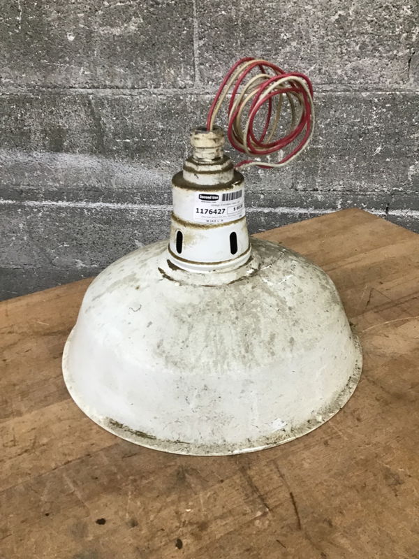 Other than being a little dirty, this vintage, white enameled steel light looks to be in pretty good condition. Free of any major chips or dings. Bulb socket looks o.k. Has at least a couple feet of wire above the fixture if you want to put it on a pendant rod.