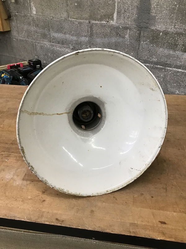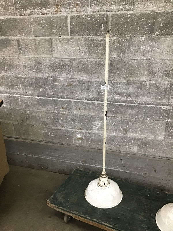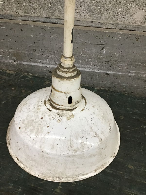 Other than being a little dirty, this vintage, white enameled steel light looks to be in pretty good condition. Free of any major chips or dings. Bulb socket looks o.k. Has a 4' pendant rod above height of fixture listed. .
