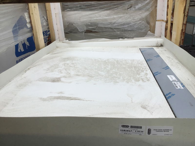 Never-installed MPL brand commercial grade shower pan. Sturdy plastic composite construction, with a channel drain. Drain cover is stored at Customer Service. Photo may be representational.