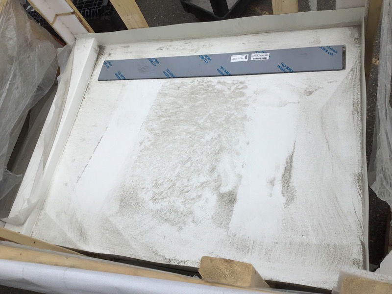 Never-installed MPL brand commercial grade shower pan. Sturdy plastic composite construction, with a channel drain. Drain cover is stored at Customer Service. Photo may be representational.