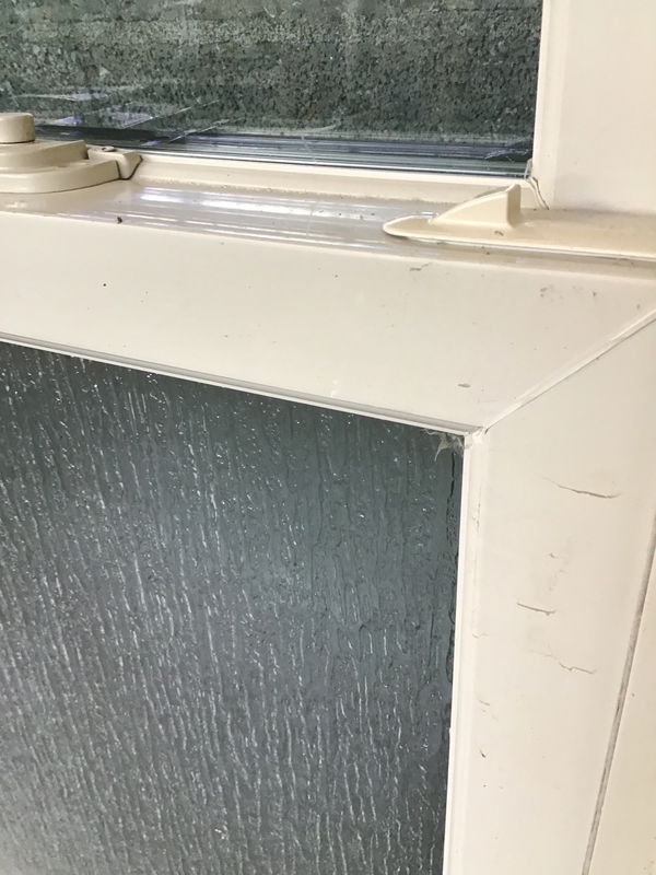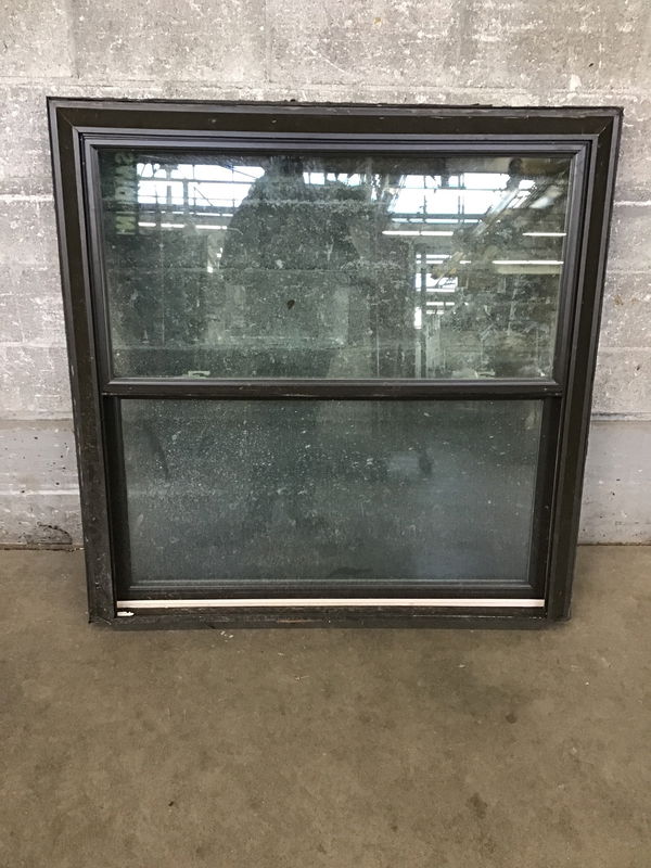 Vinyl double hung window with brown exterior and beige interior. Has obscured glass on the lower pane.
