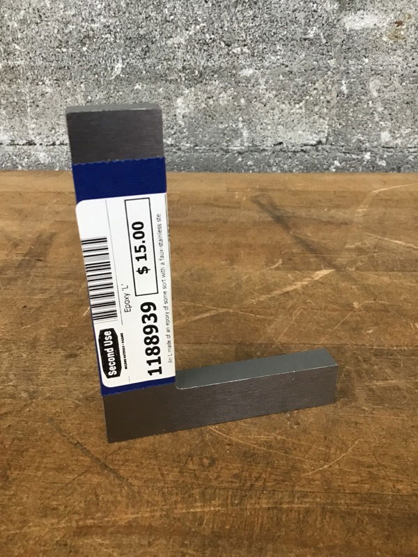 An L made of an epoxy of some sort with a faux-stainless steel finish to the front face. Perfect for the Lucas, Lily, Logan, Layla, or Levi in your life.
