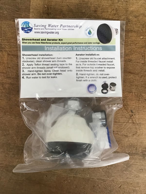 Water saving shower head/aerator kit from Saving Water Partnership of Seattle. Comes with everything you need to replace an existing shower head of similar proportions.