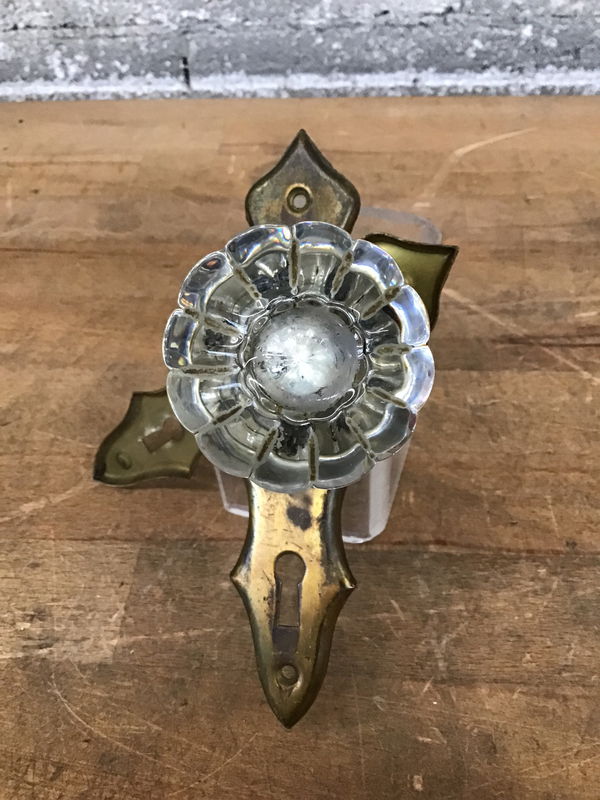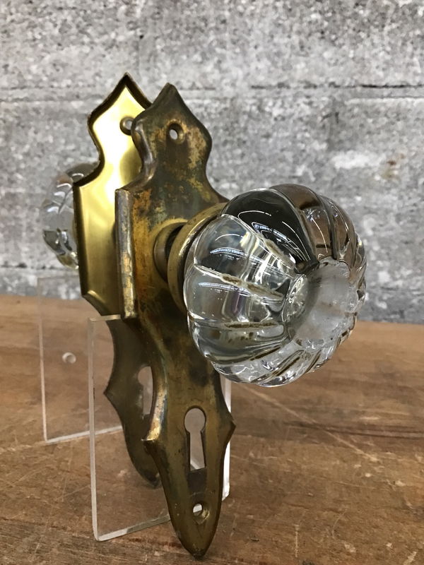 Vintage crown-like door knobs (or are they pumpkin shaped?) with brass bezels and door plates. Some wear from previous life.