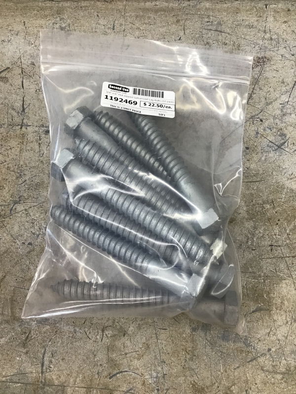 10 pack of 3/4" x 6" hot dipped galvanized steel lag bolts. Typical retail price is $4 or more per lag bolt at other stores. Our price is $2.25 each.