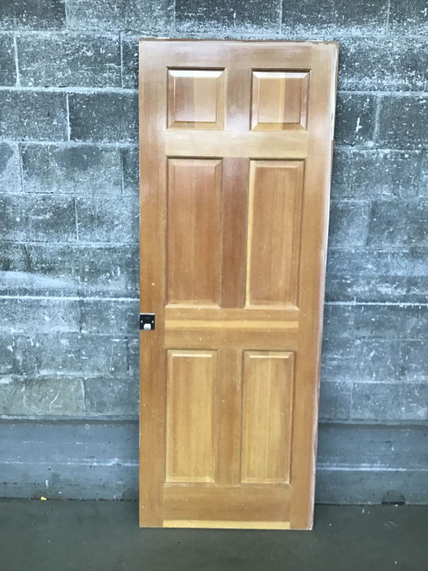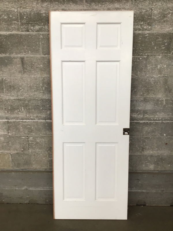 Good looking six panel pocket door, painted white on one side, clear finished fir on the other, includes recessed pull hardware.