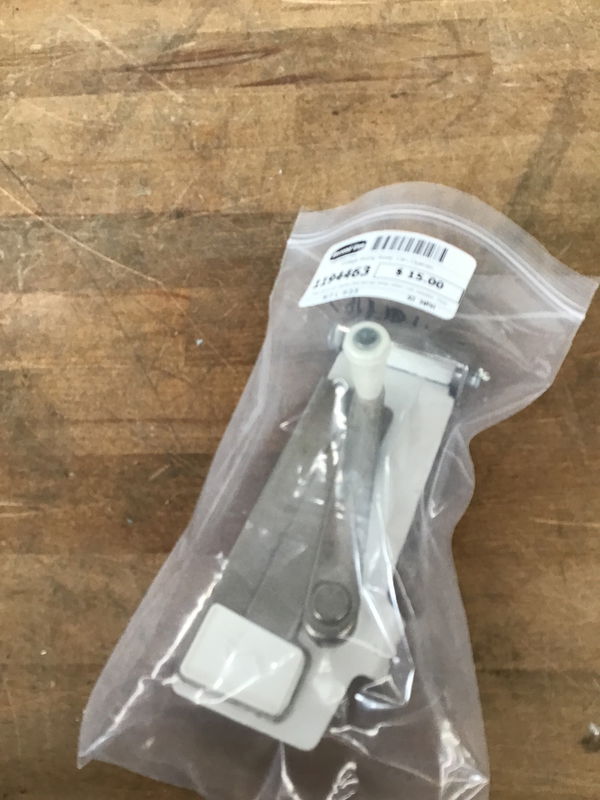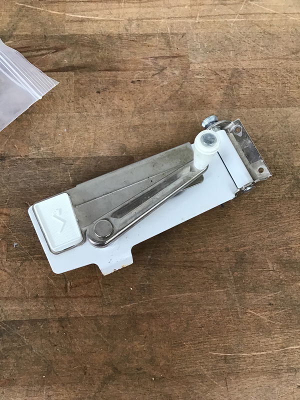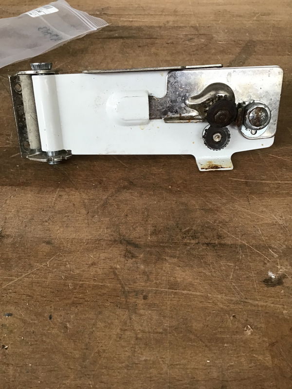 Wall mount can opener that swings away when not needed. How neat! The roller blade is a little gunky, but it's still sharp.