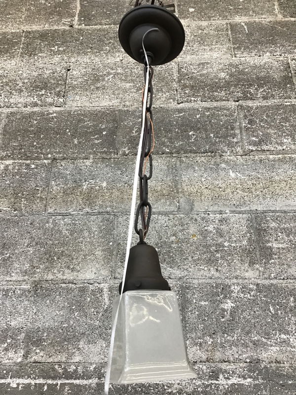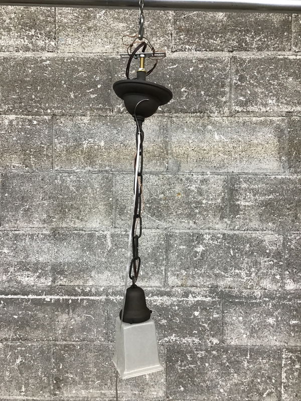 Sweet little '06 rejuvenation pendant light that features a square frosty glass shade and 'antiqued' bronze style base, chain and fitter. In great shape!