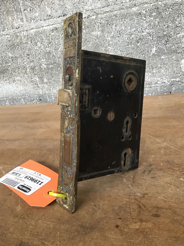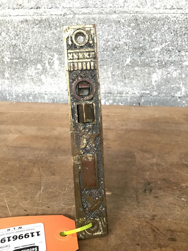 Antique Eastlake mortise with a cast brass face measuring 1"W x 6.75"H. The face is bent and needs a good scrub to remove the paint remnants, but the latch is springing back at least. Beautiful piece featuring the broken leaf motif, it just needs someone with the vision and willingness to bring it back to life.