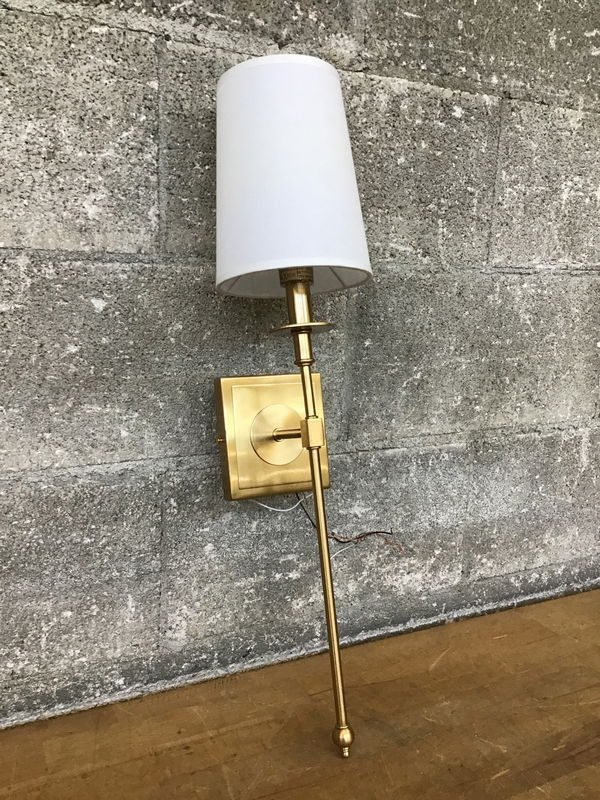 Brassy wall sconce with a white linen shade that came to us from a local lighting retailer display. Clean and free of damage, ready to install. Full product specs available here. Suitable for damp locations.