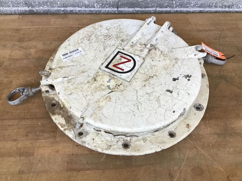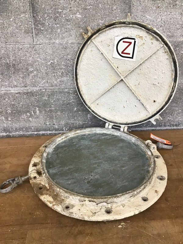 The 16 1/4" diameter plate glass is intact on this aluminum framed porthole window. It has a cast aluminum cover and comes with its securing screws, but does need a hinge pin/bolt. I put a filler in for the moment, but I think it needs something with a little more diameter. The glass does not "open" on this one. Dimensions are approximate.
