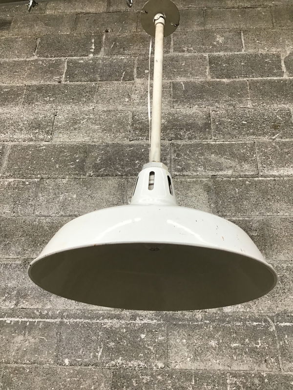 A vintage hanging commercial light fixture. White enameled metal with a 16" shade and a swivelling mount for sloped ceilings. A few spots of rust damage on the enameled shade. A fun industrial piece that would look perfect in your garage!