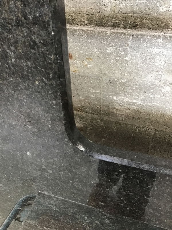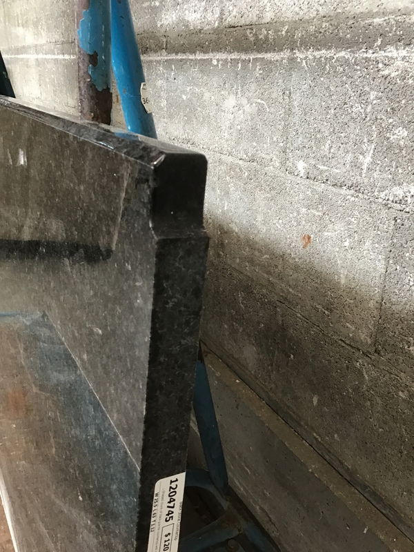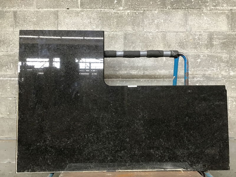 L-Shaped chunk of black granite countertop with a finished inside edge. Length listed is for the long edge, the short measures 42.5" from the corner.