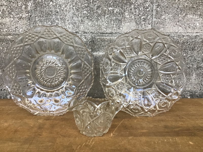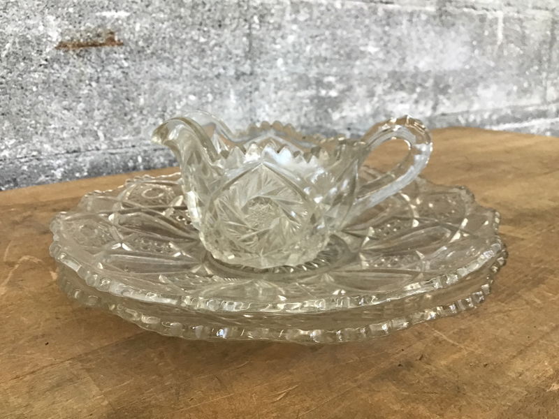 Two glass plates and a small pitcher. One of the plates is Prescut glass. They have a similar spiral geometric designs, and would look great in a display case!