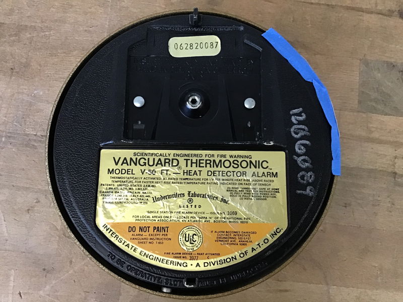 A Vanguard Theromosonic heat detector alarm. Unfortunately, it has been tested in-house, and we can verify that this thing is incredibly loud when it's activated. Here's a tip: if the plastic disk on the front comes off, wind the backside with an allen key until it stops, then replace the disk back onto its mount. We learned this the hard way. Learn from my mistakes. My ears are still ringing as I write this.