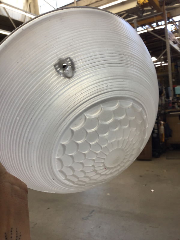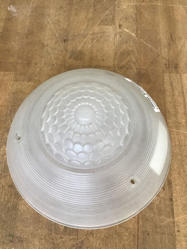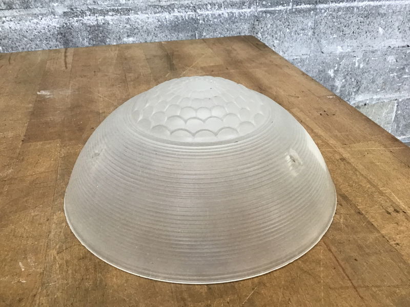 Frosted clear glass shade with a round, Art Deco style around the outside and a scalloped spider web design in the center. This one hangs from three chains (not included) on your ceiling fitter.