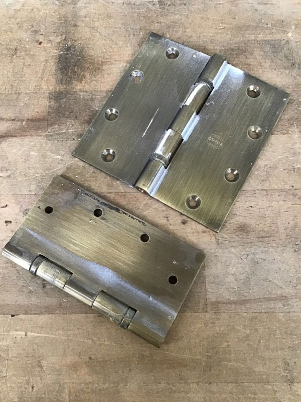 Heavy duty 5" Omnia brand brushed brass hinge pair in good shape, missing screw on finials, price reflects. Photo is representational.