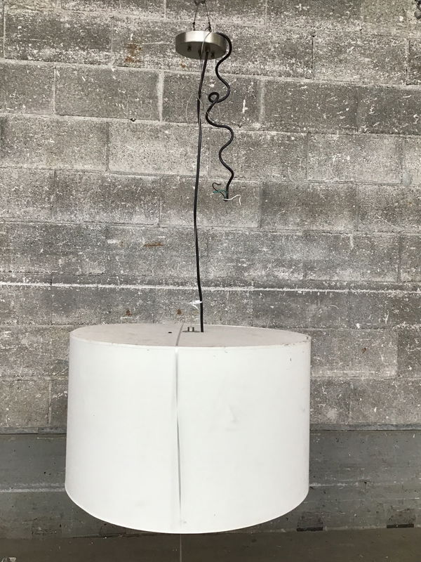 Large pendant light with a cylindrical linen shade and white plastic diffuser. Suitable for dry locations only. Height listed is just for the shade, the hanging height can be easily lengthened or shortened.