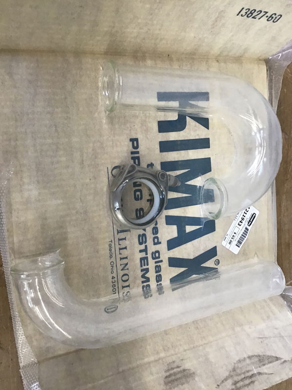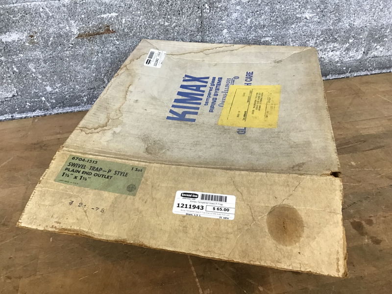 Kimax Tempered Glass P-Trap that's a little dusty from sitting on the shelf at a plumbing supply warehouse for many years, but still in its original packing. 1 1/2" Inside diameter pipe.