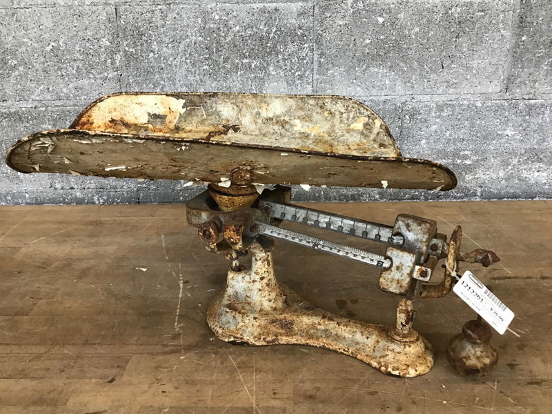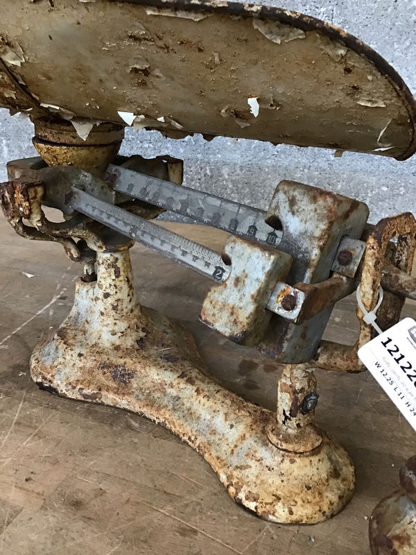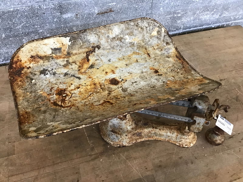 Rusty, painty old scale that looks like it was just dredged up from a superfund site...maybe it was. Great yard art.