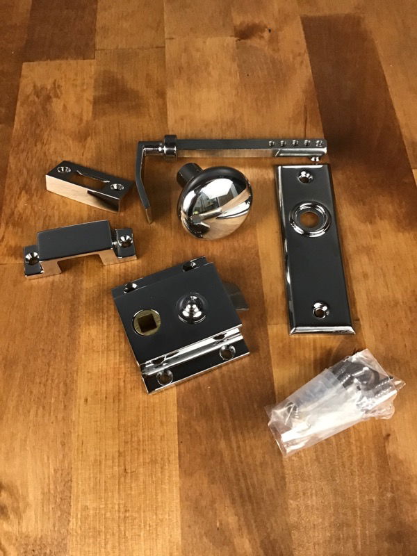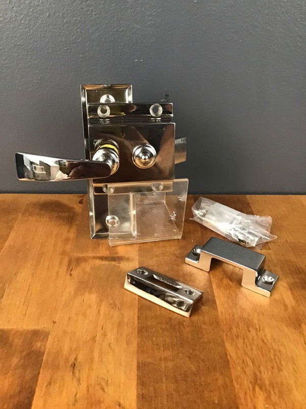 Brand new chrome screen door latch set from Merit. Part number 20297. Comes with lever on the inside, knob and door plate on the outside. Button can latch in either open or closed directions. Comes with a surface strike/latch, and an angle strike as well at all the screws need to install.