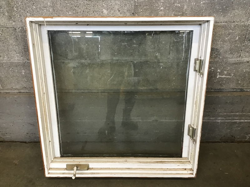 A wood-framed casement window that's definitely had some better days. It opens and closes, though there's some difficulty when cranking it shut (the handle slips). The frame is in decent shape, but it could still use some TLC and a good repaint. A great option for a shed or a treehouse!