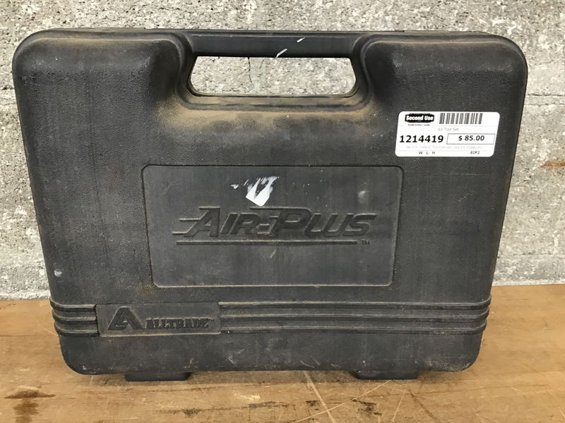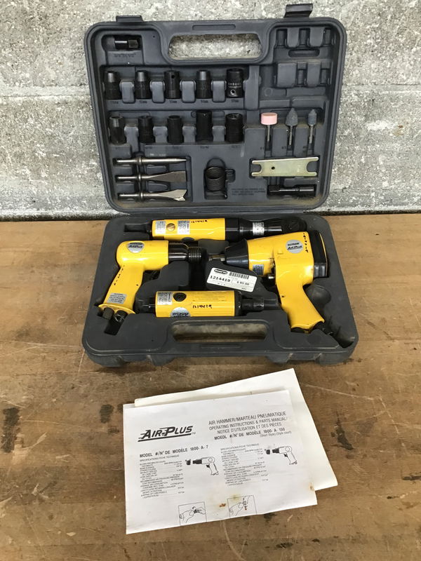Set of All Trade Air Plus pneumatic tools and accessories. Includes 1/2 inch wrench, 1/4 inch die grinder, 150mm hammer, 3/8 inch ratchet and a bunch of accessories. Not tested but everything appears in good shape.
