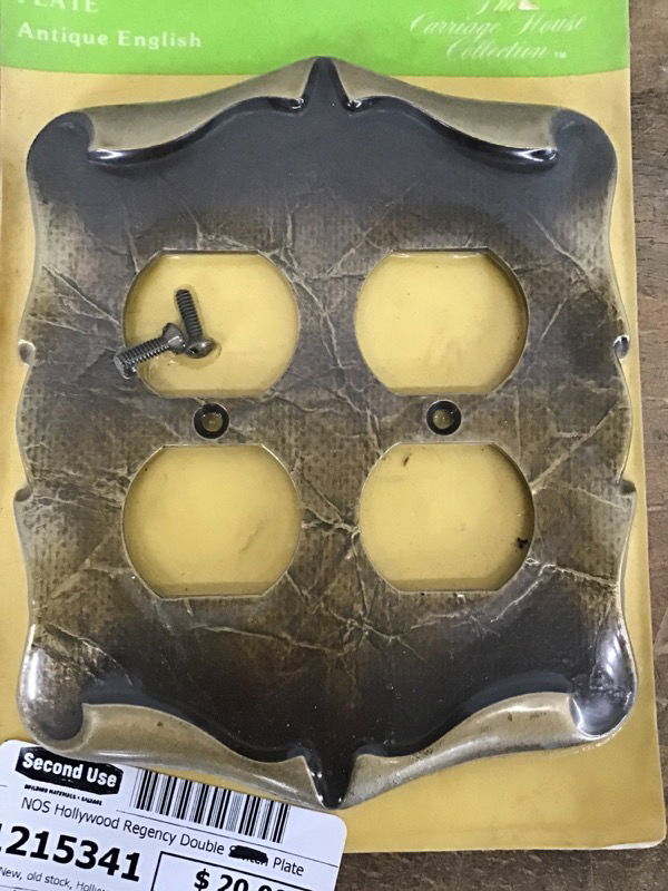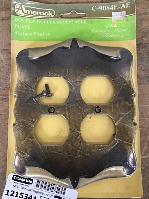New, old stock, Hollywood Regency style double duplex outlet receptacle electrical box cover with an "Antique English" (antique brass) finish (probably over diecast). Made by Amerock from "The Carriage House Collection." Model #C-9084E-AE. Photo may be representational.
