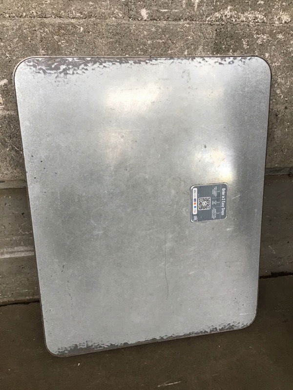 This cafe table top came to us authentically used in a cafe but with it's thick press board and steel wrapped construction, it's got years of work left in it.