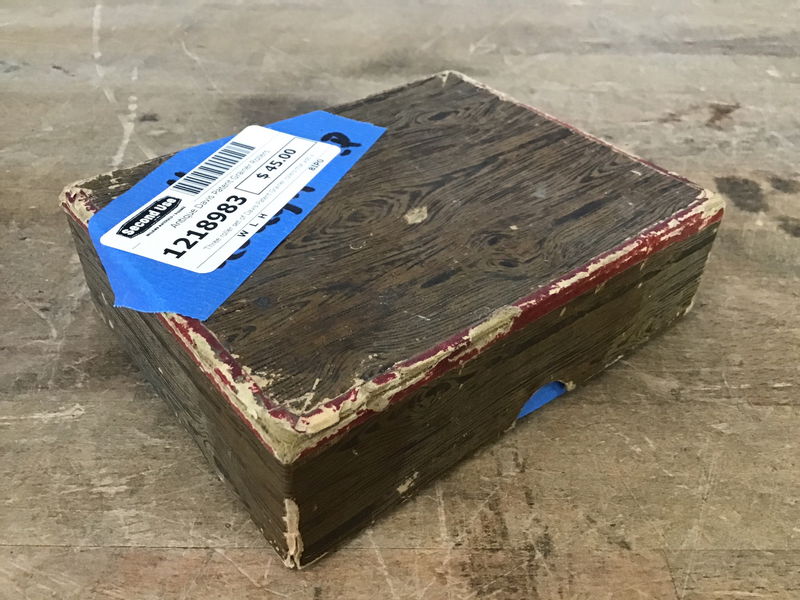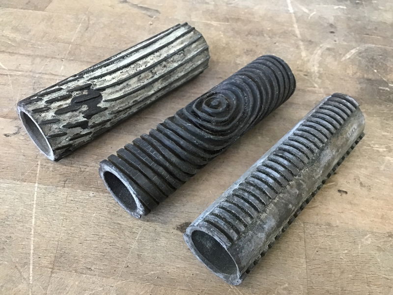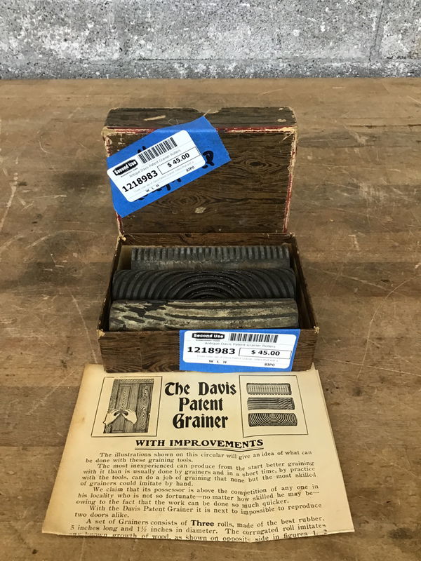 Three roller set of Davis Patent Grainer rollers that add a wood grain look to whatever your top coat is. Paperwork inside box uses a testimonial from 1905. One 4 3/4" wide roller looks to give a VG (straight) grain fir appearance, another a 5" heartwood look, and the last I believe is meant to portray quarter-sawn oak. It's also 4 3/4" wide. The original box is still in fairly good condition.