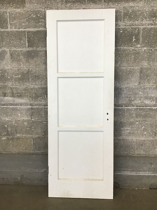 An interior three panel door with a hole drilled for vintage mortise hardware in good shape, with a white coat of paint atop layers of other paint.