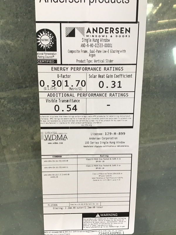 Ca. 2024 Andersen Fibrex (a composite/fiberglass material) single hung window with energy tag. Exterior and interior are white.