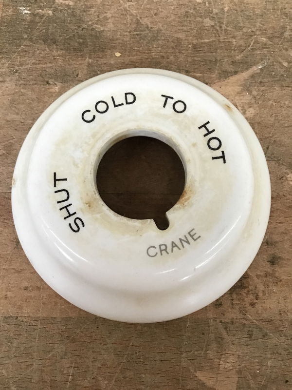 Vintage porcelain Crane bath valve cover with immaculate original font. Needs a little cleanup.