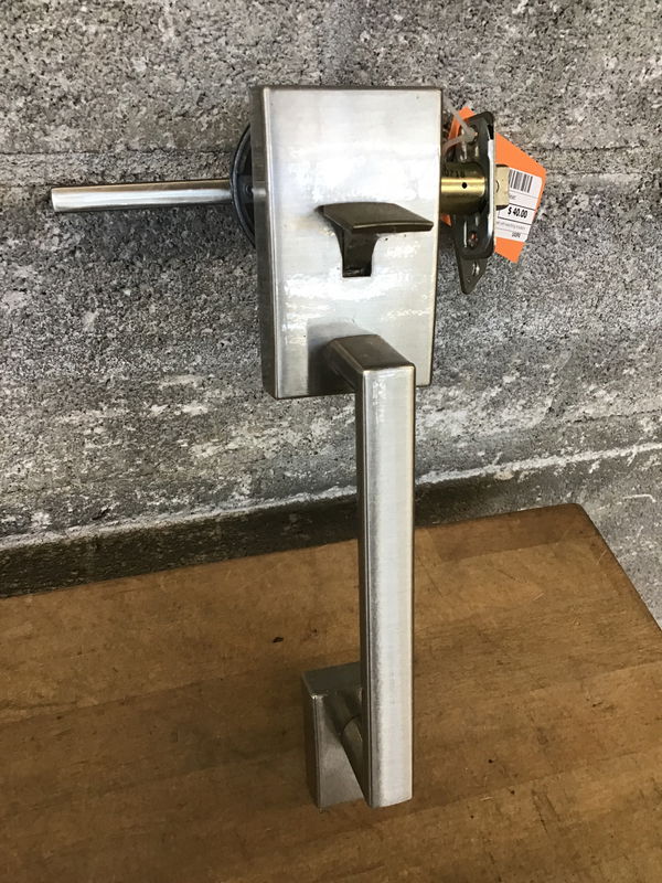 Brushed nickel entryway handleset with everything included except the strike plate. This is not keyed and will need to be paired with a deadbolt if used on an exterior door, but it could be a fabulous gate handle without!