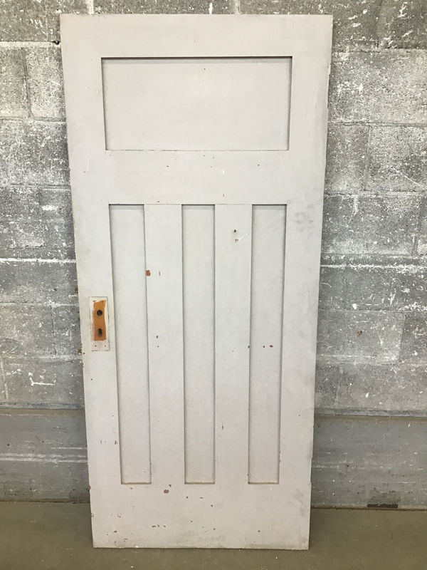 Custom ordered and totally charming craftsman style 4-panel interior door that is shorter than average but totally proporitonal. This is painted light grey on one side and "faded farmhouse yellow" on the other. This would make a fantastic closet, attic or under-stairs door.
