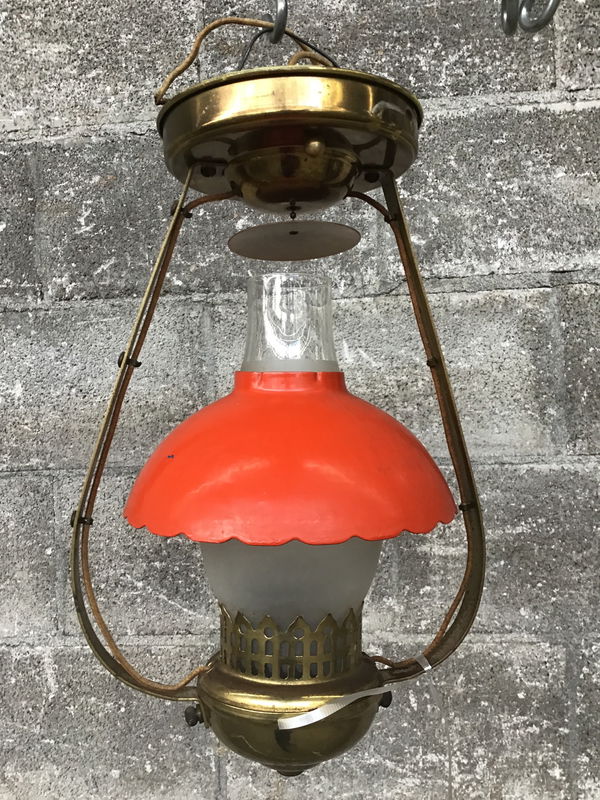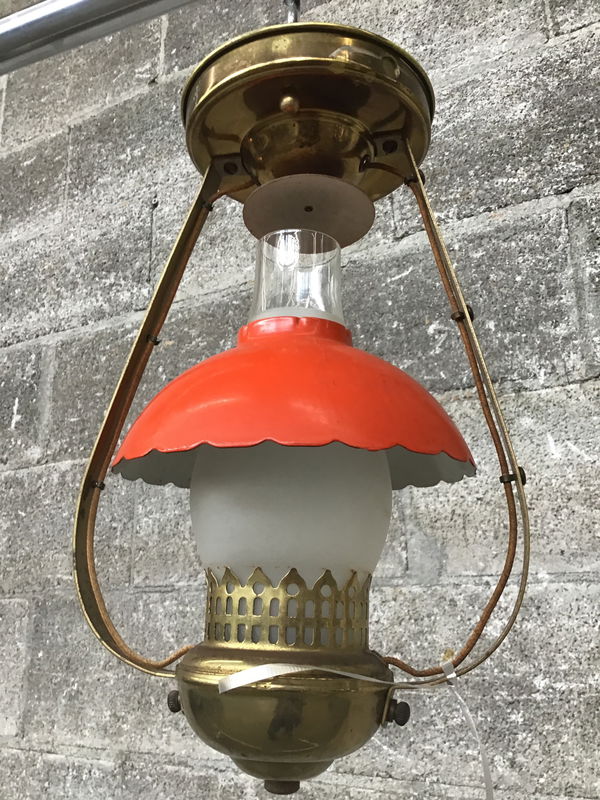 Styled after the oil lamps of yore, this petite ceiling light by Harmony House features a delicate brass body and glass hurricane shade topped with a copper dome that's been painted a delightfully bright shade of orange. Very cute, very mid-century!