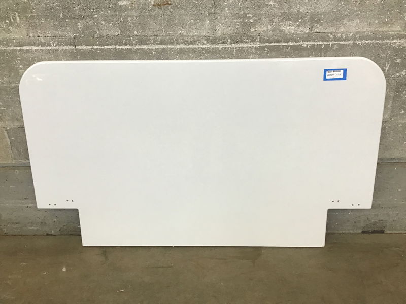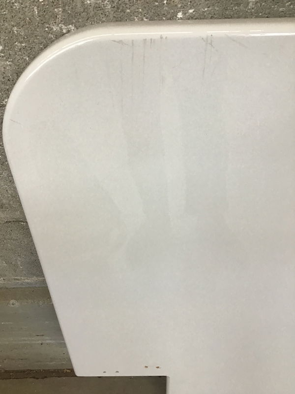 White lacquered headboard with 80s Deco vibes. Was originally attached to a full size bed, but could probably accommodate up to a queen. Cosmetic damage is minimal.