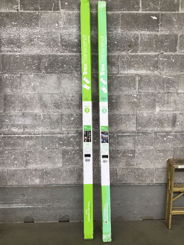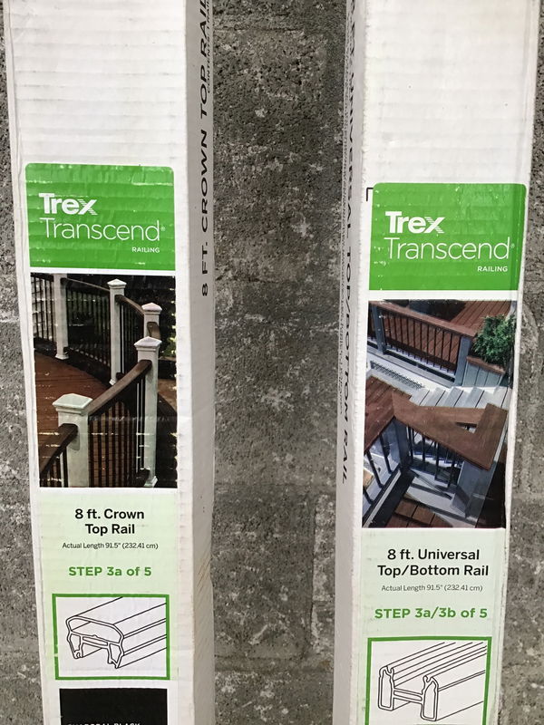 Two piece set of 8' Trex "Transcend" "Crown Top Rail" and "Universal Top/Bottom Rail" in Charcoal Black color. There are no balusters included, but this should get you started.